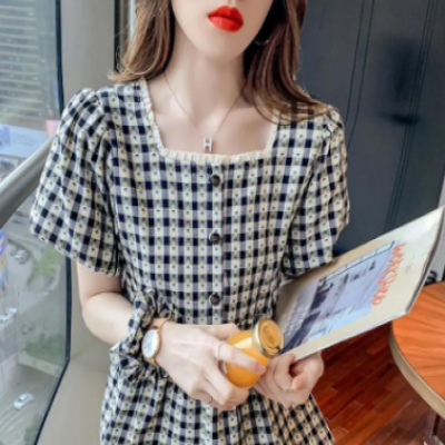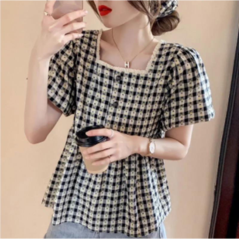Blusa con volantes y mangas abullonadas para mujer, elegante blusa de verano de dise?o a cuadros, cuello cuadrado, línea A, para ni?os (2 piezas)