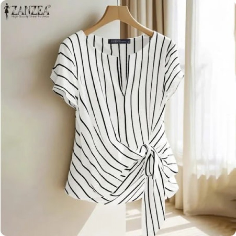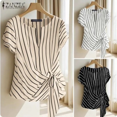 ZANZEA wanita pejabat v-neck Raglan lengan blaus Stripe cetak Knotted Work Thin Top #0421